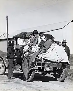 À l'époque de Roosevelt, nombre de familles des régions rurales vivaient dans une grande pauvreté, particulièrement dans le Sud. Des agences comme la Farm Security Administration, qui succéda à la Resettlement Administration, s'efforcèrent de venir en aide aux migrants et aux paysans marginaux dont les conditions de vie difficiles furent mises en lumière par le roman à succès de John Steinbeck Les Raisins de la colère, publié en 1939 et adapté au cinéma l'année suivante par John Ford. Les responsables du New Deal refusèrent néanmoins d'allouer des crédits aux citoyens pauvres désireux d'acquérir une ferme car ils estimaient que les agriculteurs étaient déjà trop nombreux[54]. En revanche, l'administration Roosevelt consacra d'importantes sommes à la remise en état des établissements de santé qui accueillaient les malades dans les régions les plus défavorisées[55]. De son côté, la Farm Credit Administration refinança de nombreux prêts hypothécaires ce qui eut pour effet de diminuer l'ampleur des saisies. En 1935, le gouvernement fédéral mit sur pied la Rural Electrification Administration (REA) qui intensifia la construction de lignes électriques dans les zones rurales et permit de la sorte à des millions de personnes d'avoir accès pour la première fois à l'électricité[56]. Dans la décennie qui suivit la création de la REA, le pourcentage de fermes reliées au réseau électrique passa de moins de 20 % à près de 90 %[57].