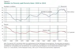 La publication du livre The Other America (« L'autre Amérique ») en 1962 avait permis de mettre en lumière la précarité dans laquelle vivait une partie de la population américaine, et l'administration Kennedy avait commencé à élaborer un programme de lutte contre la pauvreté[82]. En 1964, 21 % des Américains étaient considérés comme pauvres, parmi lesquels 50 % étaient des Noirs[83]. Dans son discours sur l'état de l'Union de 1964, Johnson annonça que « cette administration, à partir d'aujourd'hui, ici et maintenant, déclare une guerre inconditionnelle à la pauvreté en Amérique »[84]. En avril de la même année, il promulgua l’Economic Opportunity Act of 1964 qui créait le Bureau des opportunités économiques (OEO). Le rôle de cette agence était de superviser le travail des agences locales communautaires qui venaient en aide aux personnes vivant dans la pauvreté[85]. La loi donnait également naissance à un programme de formation professionnelle, le Job Corps, et à AmeriCorps VISTA, une variante fédérale des Corps de la Paix[86]. À travers ce texte, Johnson était convaincu que le gouvernement serait en mesure de mieux aider les pauvres en leur offrant des opportunités économiques[87]. Johnson sut obtenir un soutien suffisant de la part des démocrates conservateurs pour faire adopter le projet de loi, qu'il ratifia le [88]. Sous la direction de Sargent Shriver, l'OEO mit en œuvre des programmes comme Head Start ou le Neighborhood Legal Services[89]. Johnson persuada également le Congrès d'adopter le Food Stamp Act of 1964 qui rendait permanents les programmes pilotes de bons alimentaires initiés par le président Kennedy en 1961[90].