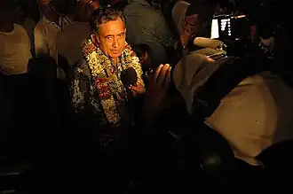 Il se rend également à New York, notamment pour obtenir le soutien du mouvement des non-alignés le [24]. Le projet de résolution demandant la réinscription est déposé au secrétariat des Nations unies le [25], sous le parrainage des îles Salomon, Nauru et Tuvalu, mais est ensuite remanié en en faisant disparaître du texte la mention à la réinscription sur la liste des territoires non autonomes ainsi que la nécessité pour la France de contractualiser avec la Polynésie française un processus d'autodétermination par un accord. Ces deux dispositions enlevées, la nouvelle version se contente de prier « le Gouvernement français d’intensifier son dialogue avec la Polynésie française afin de faciliter et d’accélérer la mise en place d’un processus équitable et effectif d’autodétermination »[26]. Et alors que le vote du texte devait avoir lieu le , il n'est pas inscrit pour cette date à l'ordre du jour et est repoussé à une date indéterminée[27].