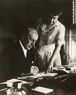 Le chef de cabinet de Wilson, faisant office de secrétaire, fut Joseph Patrick Tumulty de 1913 à 1921. Tumulty servit d'intermédiaire avec la presse, et sa vivacité d'esprit contrastait avec l'attitude souvent froide du président[15]. La première épouse de celui-ci, Ellen Wilson, mourut le [16] et Wilson se maria en secondes noces avec Edith Bolling Galt en 1915[17]. Cette dernière prit entièrement en charge la gestion de l'agenda du président, en lieu et place de Tumulty dont l'influence diminua. Le conseiller le plus important en matière de politique étrangère était le « colonel » Edward M. House, qui fut aussi le confident de Wilson jusqu'à leur rupture au début de l'année 1919, en raison des maladresses commises par House en l'absence de Wilson lors de la conférence de paix de Paris[18]. Quant au vice-président Thomas R. Marshall, il ne joua pas un rôle très important au sein de l'administration[19].