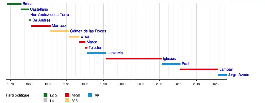 Depuis l'élection régionale de 1983, neuf personnes ont exercé cette fonction (quatre socialistes, deux régionalistes et deux conservateurs), ainsi qu'une par intérim. Le socialiste Marcelino Iglesias détient le record de longévité avec trois mandats successifs de quatre ans, tandis que la conservatrice Luisa Fernanda Rudi est à la seule femme à avoir exercé cette fonction.