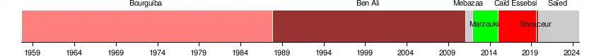 Premier ministre et ministre de l'Intérieur du président Bourguiba, Zine el-Abidine Ben Ali fait destituer le chef de l'État, évoquant un âge trop élevé pour continuer à présider le pays. En , il doit faire face à une importante vague de protestations populaires ; il quitte finalement la présidence le , sous la pression des manifestants, et se réfugie en Arabie saoudite, en compagnie de son épouse Leïla Ben Ali.