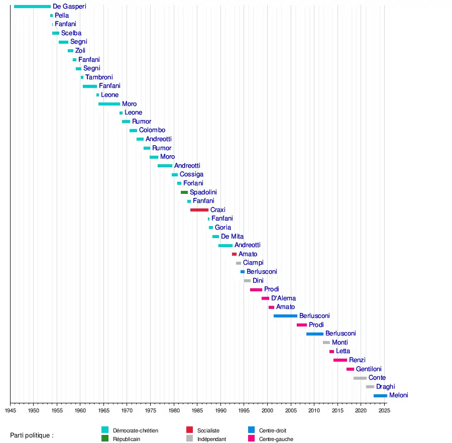 212 jours | Démocratie chrétienne | De Gasperi I | DC • PCI • PLI • PSIUP • PdA • PDL | Humbert II![]() (1946) |