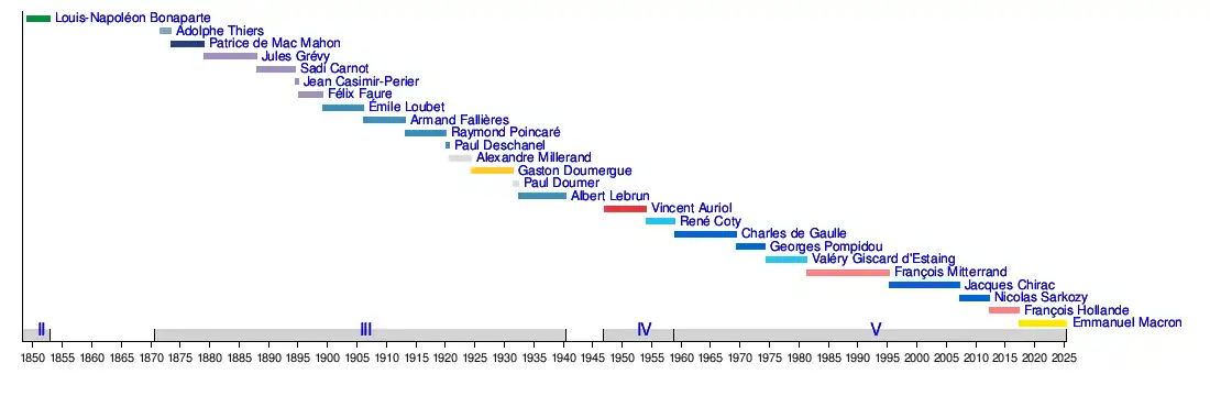 Cette frise chronologique ne présente pas la Première République car la fonction de président de la République n'avait pas été créée. Le mandat de Président de la Convention nationale était de seulement deux semaines, soit 26 mandats par an.