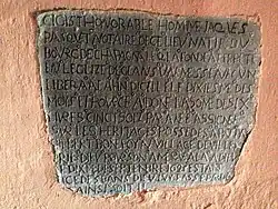 - « Cy gist honorable homme Jaques Pasquet notaire de ce lieu natif du bourg de Champagna le(quel) la fondé à perpétuité en l’églize de céans une messe avec libera à la fin d’icelle le dixiesme des moys et pur ce ai doné la somme de six livres conct solz par anée assignés sur les héritages à p(rése)nt par Gilbert Bonefoy au village de Viller. Priez Dieu pour son âme que a la (elle aille à) Dieu. Le dixième de septembre 1625 estant agé de 58 ans. Dieu lui fasse pardon. Ainsi soit il. »