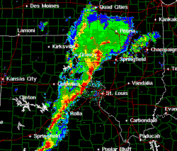 Ligne d'orages violents, vus par radar, qui ont donné des tornades les 5 et près de Saint Louis (Missouri), États-Unis. Remarquez la ligne intense avec arcs (source : NOAA)
