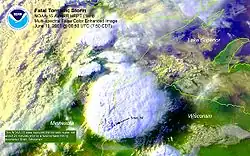 Orage supercellulaire vu par satellite : on remarque sur la partie arrière (près de Siren, Wisconsin) les sommets plus élevés faisant de l'ombre sur le reste du Cumulonimbus (source : NOAA)