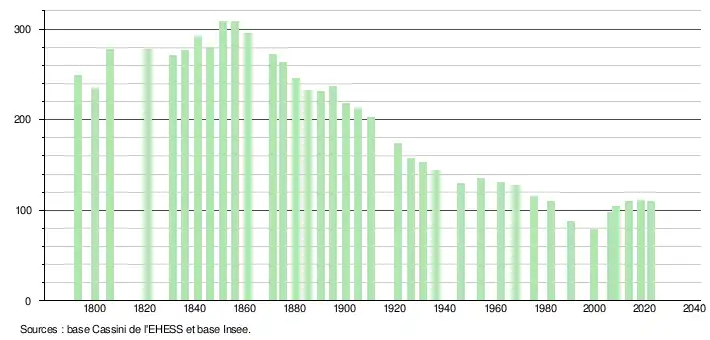 L'évolution du nombre d'habitants est connue à travers les recensements de la population effectués dans la commune depuis 1793. Pour les communes de moins de 10 000 habitants, une enquête de recensement portant sur toute la population est réalisée tous les cinq ans, les populations de référence des années intermédiaires étant quant à elles estimées par interpolation ou extrapolation[14]. Pour la commune, le premier recensement exhaustif entrant dans le cadre du nouveau dispositif a été réalisé en 2008[15].