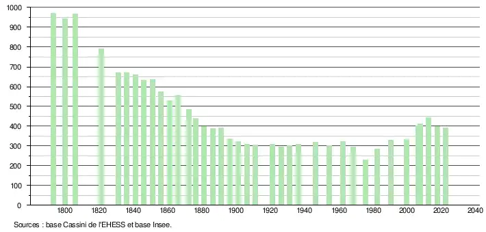 L'évolution du nombre d'habitants est connue à travers les recensements de la population effectués dans la commune depuis 1793. Pour les communes de moins de 10 000 habitants, une enquête de recensement portant sur toute la population est réalisée tous les cinq ans, les populations de référence des années intermédiaires étant quant à elles estimées par interpolation ou extrapolation[30]. Pour la commune, le premier recensement exhaustif entrant dans le cadre du nouveau dispositif a été réalisé en 2007[31].