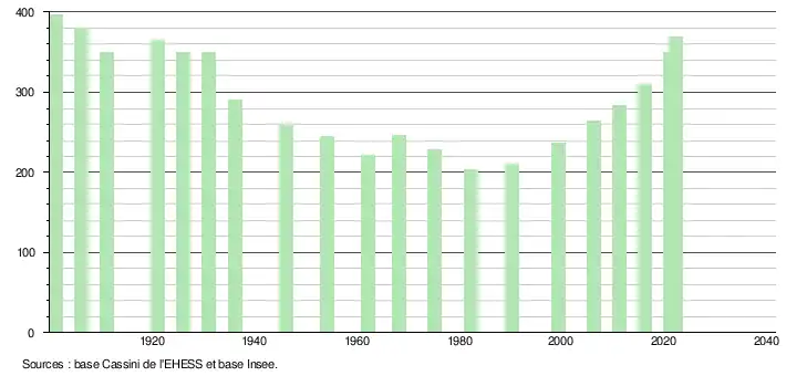 L'évolution du nombre d'habitants est connue à travers les recensements de la population effectués dans la commune depuis 1901. Pour les communes de moins de 10 000 habitants, une enquête de recensement portant sur toute la population est réalisée tous les cinq ans, les populations de référence des années intermédiaires étant quant à elles estimées par interpolation ou extrapolation[23]. Pour la commune, le premier recensement exhaustif entrant dans le cadre du nouveau dispositif a été réalisé en 2006[24].