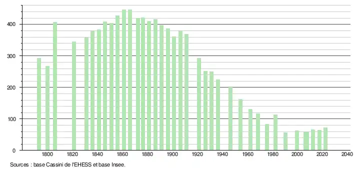 L'évolution du nombre d'habitants est connue à travers les recensements de la population effectués dans la commune depuis 1793. Pour les communes de moins de 10 000 habitants, une enquête de recensement portant sur toute la population est réalisée tous les cinq ans, les populations de référence des années intermédiaires étant quant à elles estimées par interpolation ou extrapolation[17]. Pour la commune, le premier recensement exhaustif entrant dans le cadre du nouveau dispositif a été réalisé en 2007[18].