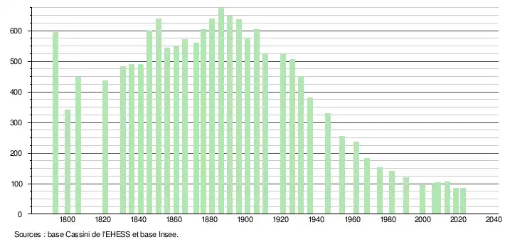 | L'évolution du nombre d'habitants est connue à travers les recensements de la population effectués dans la commune depuis 1793. Pour les communes de moins de 10 000 habitants, une enquête de recensement portant sur toute la population est réalisée tous les cinq ans, les populations de référence des années intermédiaires étant quant à elles estimées par interpolation ou extrapolation[22]. Pour la commune, le premier recensement exhaustif entrant dans le cadre du nouveau dispositif a été réalisé en 2008[23]. En 2022, la commune comptait 86 habitants[Note 2], en évolution de −11,34 % par rapport à 2016 (Corrèze : −0,59 %, France hors Mayotte : +2,11 %). |