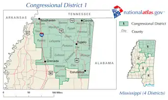 Le 1er district congressionnel du Mississippi se trouve dans le coin nord-est de l'État. Il comprend une grande partie de la partie nord de l'État, notamment Columbus, Oxford, Southaven, Tupelo et West Point. L'Université du Mississippi (Ole Miss) se trouve dans le quartier.