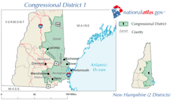 Le 1er district congressionnel du New Hampshire couvre une partie du sud du New Hampshire et la partie orientale de l'État. Le district comprend des parties des comtés de Hillsborough, Rockingham, Merrimack, Grafton et Belknap ; et l'intégralité des comtés de Strafford et Carroll.