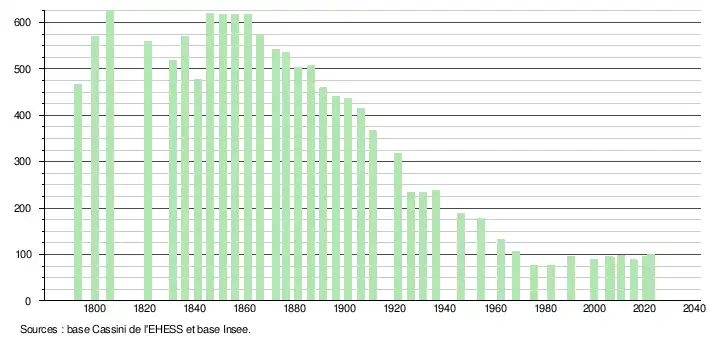 L'évolution du nombre d'habitants est connue à travers les recensements de la population effectués dans la commune depuis 1793. Pour les communes de moins de 10 000 habitants, une enquête de recensement portant sur toute la population est réalisée tous les cinq ans, les populations de référence des années intermédiaires étant quant à elles estimées par interpolation ou extrapolation[18]. Pour la commune, le premier recensement exhaustif entrant dans le cadre du nouveau dispositif a été réalisé en 2005[19].