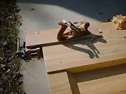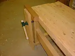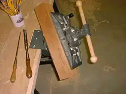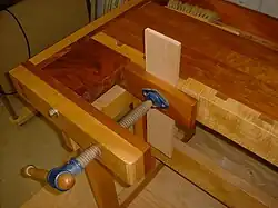 Une planche immobilisée dans une presse à épaulement traditionnelle, vis en bois.