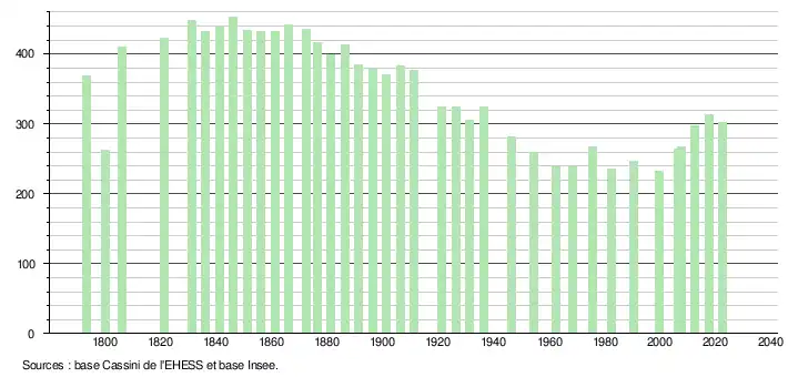 L'évolution du nombre d'habitants est connue à travers les recensements de la population effectués dans la commune depuis 1793. Pour les communes de moins de 10 000 habitants, une enquête de recensement portant sur toute la population est réalisée tous les cinq ans, les populations de référence des années intermédiaires étant quant à elles estimées par interpolation ou extrapolation[20]. Pour la commune, le premier recensement exhaustif entrant dans le cadre du nouveau dispositif a été réalisé en 2007[21].