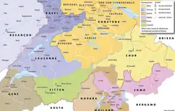 Les zones contrôlées par les évêques s'étendaient sur une grande partie de l'ancienne Rhétie, comprenant la plupart des Grisons actuelles, Chiavenna et Bormio au sud, ainsi qui le val Venosta à l'est. Ils sont entrés en conflit, avec des familles nobles de Souabe, comme la famille von Sax, les comtes de Montfort, plus tard la maison de Habsbourg, mais aussi avec ses puissants voisins, les ducs de Milan et les comtes de Tyrol. Déjà au XIVe siècle les domaines de Chiavenna et Bormio sont passés à Milan. Le val Venosta était sous la domination du Tyrol, où le Habsbourg archiduc Rodolphe IV d'Autriche gouvernait depuis 1363.