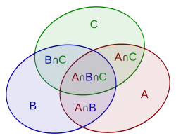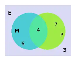 Une zone de couleur représente un groupe. E représente le groupe entier d’étudiants, M représente ceux qui ont la propriété d'« étudier les mathématiques », P représente ceux qui possèdent la propriété d'« étudier la physique ».