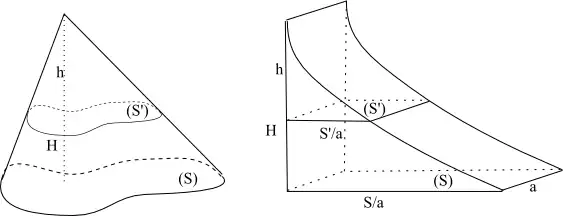 Dans la figure ci-dessus, chaque section est déformée en un rectangle de même aire et de largeur a. Les propriétés de proportion sur les surfaces assurent que