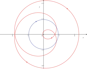 - l'autre cas est : , alors l'indice des deux zéros est égal à 1 et l'image du lacet par tourne deux fois autour de l'origine en effet :