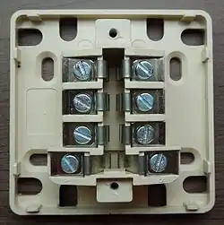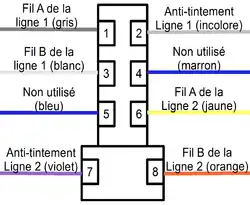 | 2 | 2 | 2 | anti-tintement ligne 1 | ce fil sert quand on connecte plusieurs téléphones à cadran sur la même ligne, il évite - lorsqu'on compose un numéro sur un poste - de faire tinter les sonneries des autres postes. Permettait également l'équilibrage des sonneries électromagnétiques (ainsi toutes recevaient la même tension). Rendu obsolète par la numérotation multi-fréquence (DTMF) et les sonneries électroniques | |