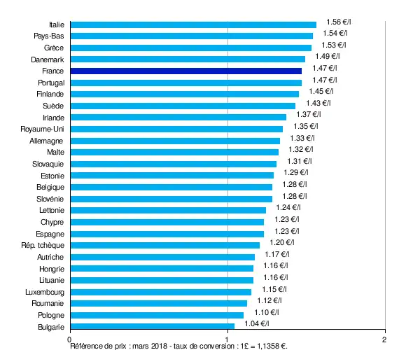 En , le prix à la pompe du gazole s'établit en France à 1,515 € pour le diesel et à 1,535 € pour le SP 95. La France arrive dès lors en 8e position pour ce qui concerne le SP 95 derrière l'Italie (1,649 €), la Grèce (1,631 €), les Pays-Bas, le Danemark, l'Allemagne, le Portugal et la Finlande. Elle est en 5e position pour le gazole derrière la Suède (1,584 €), la Belgique (1,573 €), le Royaume-Uni et l'Italie[51]. La Belgique connaît en particulier une spectaculaire augmentation des prix maximums, le prix maximum du gazole passant de 1,374 €/l le à 1,634 €/l le [52].