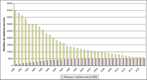 Les prix des carburants sont fixés par l'État jusqu'en 1981 et la distribution est confiée à des réseaux dits traditionnels quasi exclusivement constitués de sociétés pétrolières. Cette situation peu concurrentielle s'achève en 1981. À cette date l'État décide de libéraliser les prix et autorise aussi les grandes surfaces à distribuer du carburant, ce qui va profondément modifier le paysage de la station-service en France. Le nombre de stations en grandes et moyenne surface va en effet être multiplié par un peu plus de 3 en 30 ans [10].