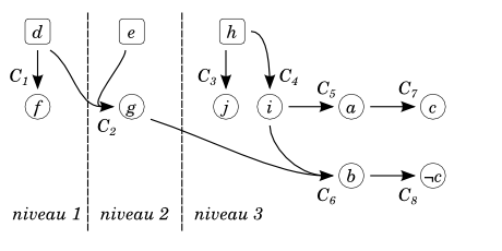 accompagné de l'interprétation à laquelle les niveaux des différents littéraux ont été spécifiés ainsi que le littéral menant à l’inconsistance : . Alors, il est possible d'en tirer le graphe suivant.