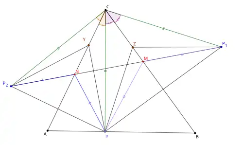 Ainsi, il faut trouver un point de de sorte que [P1P2] soit de longueur minimale. On remarque que ce segment est la base d'un triangle isocèle P2P1C avec comme angle constant 2γ au point et comme côtés CP1 = CP2 = CP. Ainsi, il faut choisir sur de sorte que CP1 = CP soit minimal. Il est évident que ce minimum est obtenu lorsque est le pied de la hauteur issue de .
