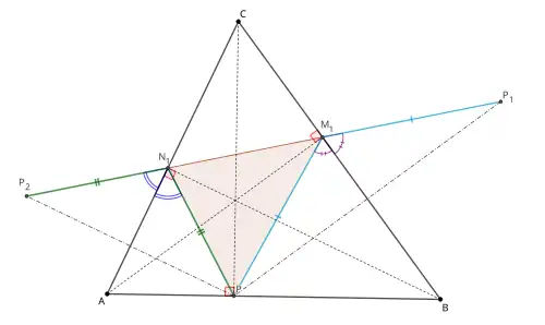 On considère dans un premier temps une version plus simple du problème. On fixe un point arbitraire sur , afin de déterminer les points et sur et respectivement, tels que MNP soit de périmètre minimal (ce minimum dépendra du choix de ). Soit P1 l'image de par la réflexion d'axe et P2 d'axe . Alors CP1 = CP2, et . En posant , on en déduit . De plus, 2γ < 180°, puisque γ < 90°, par définition. Par conséquent, la droite (P1P2) coupe les côtés et de ABC aux points et respectivement et le périmètre de MNP est égal à la distance P1P2. D'une manière analogue, si est un point quelconque sur et un point quelconque sur , le périmètre de ZPY est égal à la longueur de la ligne brisée P1ZYP2, qui est supérieure ou égale à P1P2. Ainsi, le périmètre de ZPY est supérieur ou égal au périmètre de PMN et l'égalité a lieu précisément lorsque et .