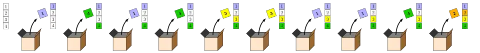L'objectif du collectionneur est de posséder une vignette pour chacun des n types de vignettes. Pour cela, il achète des boîtes de céréales. Comme le montre la figure ci-dessous, il y a une vignette dans chaque boîte. Dans l'exemple, il achète sa première boîte dans laquelle il obtient la vignette 1. Il achète la deuxième boîte et on obtient la vignette 4. Dans son troisième achat, il obtient la vignette 1 à nouveau : sa collection reste donc la même, à savoir il possède la vignette 1 et 4. Il continue à acheter des boîtes de céréales jusqu'à obtenir une vignette de chaque type. On suppose que toutes les vignettes sont équiprobables : on a une probabilité de 1n d'obtenir tout type de vignettes lors de l'achat d'une boîte.