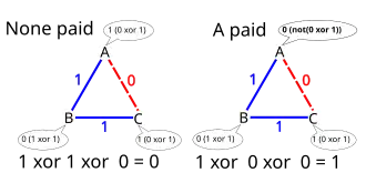 - s'il n'a pas payé le repas, le ou exclusif (XOR) des deux bits secrets qu'il connaît avec ses voisins,