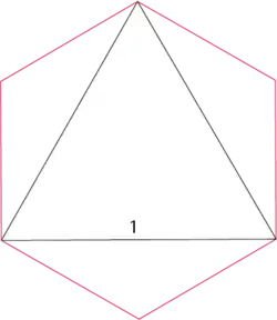 Puis il a montré qu'on pouvait "raboter" deux sommets de l'hexagone, en enlevant deux triangles laissant toujours un cercle inscrit de diamètre 1, tout en conservant la propriété. Cet hexagone tronqué de Pál a une aire de .