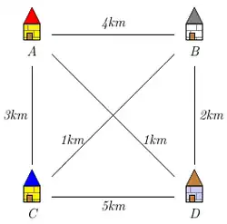 Attention, les distances dans l'exemple ne respectent pas l'inégalité triangulaire : d(A,B) < d(A,D) + d(D,B).
