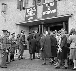 "Rééducation": les habitants de la ville de Burgsteinfurt vont au cinéma, où sont projetées des images d'après la libération des camps de concentration de Bergen-Belsen et Buchenwald le 30 mai 1945. La police militaire britannique ainsi que des policiers allemands sont stationnés à l'entrée du cinéma.