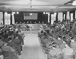 4 décembre 1945: la salle d'audience avec la table des juges ; c'est dans cette salle qu'eut lieu le procès de Dachau