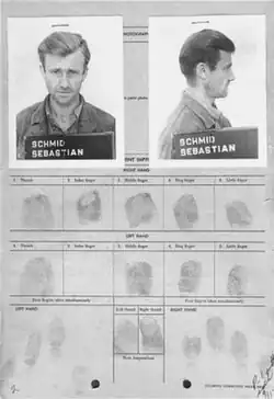 La fiche de détenu de Sebastian Schmid, qui présente deux photos et ses empreintes digitales ; Schmid était l'un des accusés d'un procès annexe au procès principal de Dachau. Chauffeur et mécanicien en qualité de Unterscharführer SS au camp de Dachau, il fut condamné le 18 septembre 1947 à une peine d'emprisonnement à perpétuité pour maltraitance de détenus. En appel, sa peine fut commuée en une peine d'emprisonnement de dix ans. Les fiches de détenus furent mises en place pour tous les accusés des procès de Dachau.