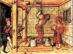 Menés par l'Inquisition, les interrogatoires se révéleront particulièrement brutaux, à l'image des moyens employés à cette époque[Note 2]. Si l'affaiblissement physique (nourriture limitée à du pain et de l'eau) ou psychologique (influence sur l'émotivité) sont utilisés, on note également l'emploi du chevalet, de l'estrapade et de la brûlure de la plante des pieds[25].