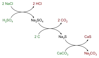 Si on résume de façon simplifiée les deux dernières opérations où le mélange est porté continûment à plus de 940 °C, le sulfate de sodium obtenu est mélangé avec du charbon de bois, puis de la craie (ou carbonate de calcium CaCO3). On a une réaction d'oxydo-réduction :