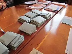L'urne est ouverte ; les enveloppes sont regroupées par centaines, afin d'être comptées puis dépouillées.