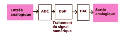 - peut acquérir les données numériques d'un convertisseur analogique-numérique (CAN ou ADC), appliquer un traitement à ces données et les restituer au monde extérieur grâce à un convertisseur numérique-analogique (CNA ou DAC) ;