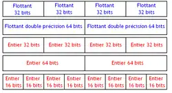 Généralement, ces registres ne sont pas spécialisés : ils peuvent stocker indifféremment des entiers et des flottants. Et leur contenu s’adapte suivant leur taille. C'est-à-dire qu'un registre de 128 bits pourra stocker indifféremment :
