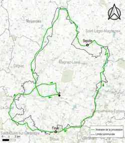 Le circuit de la procession de Neuf lieues est particulièrement singulier, tant par sa longueur exceptionnelle parcourue en moins d'une journée, par son important nombre de stations de prière que par la forme de son circuit circumambulatoire en forme de limaçon de Pascal, une courbe plane fermée présentant un point double, obtenue en traçant le mouvement décrit par un point d'un disque roulant (sans glisser) sur un cercle. La courbe a été étudiée par Gilles Personne de Roberval vers 1640-1650, donc postérieurement à la date présupposée de la procession dans sa forme actuelle. Si le circuit s'écarte sensiblement du tracé formel de la figure géométrique, il possède néanmoins un axe orthonormé ayant pour centre l’église de Magnac-Laval et pour axe horizontal les deux croix des communes du Dorat (Montgomard) et de Dompierre (Ayres) dédiées à saint Pierre, fêté le 29 juin, et pour axe vertical les deux croix des communes de Droux (Martyrs) et Lussac-les-Églises (Graulde) dédiées à saint Martial, fêté le 30 juin[17].