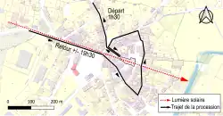 Lors de la rentrée en ville en fin de parcours, le soleil couchant accompagne la fin de la procession, la statue dorée du saint apparaissant alors nimbée d'un halo solaire pour les spectateurs attendant près de l’église. Cela est dû à la conjonction de l'orientation est-ouest de l'église et de la voie qui y accède avec la date de l'événement. À la date du lundi de Pentecôte, dans la période du 12 mai au 15 juin, le soleil se couche dans l’axe ouest de l’église, recoupant Chercorat au croisement du circuit[18].