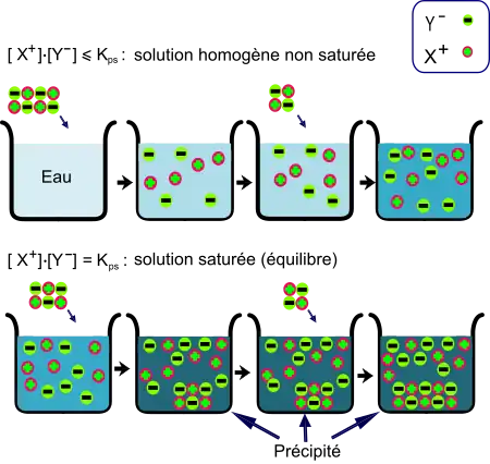 Soit s la solubilité de XαYβ. On pose . La dissolution dans 1 L d'eau pure de x moles de XαYβ donne αx moles de Xα et βx moles de Yβ. On peut décrire la situation de la manière suivante :