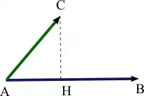 Soit A, B et C, trois points distincts, la trigonométrie du triangle rectangle permet de calculer le produit scalaire grâce à une projection orthogonale. En effet, si H est le projeté orthogonal de C sur la droite (AB), le produit scalaire est alors en valeur absolue égal au produit des distances AH et AB. Si A se trouve entre H et B, le produit scalaire est négatif et positif sinon. On remarque que si H est confondu avec A, alors le produit scalaire est nul.