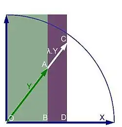 Sur le dessin, les parallélogrammes ont été déformés en rectangles de même aire par la propriété de cisaillement. L'aire verte correspond à un produit scalaire positif et l'aire rose à un produit scalaire négatif.