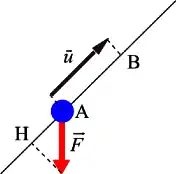 Le produit scalaire est parfois utilisé sous cette forme pour déterminer le travail d'une force lors d'un déplacement : le travail de la force F selon le trajet u est le produit scalaire des deux vecteurs. Dans la seconde illustration, ce travail est égal à –AB × AH.