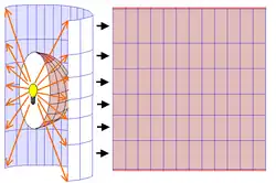 - (en) Cet article est partiellement ou en totalité issu de l’article de Wikipédia en anglais intitulé « Central cylindrical projection » (voir la liste des auteurs).